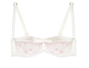 • White Stretch Silk with Pink Polka Dot Tulle Balconette Bra