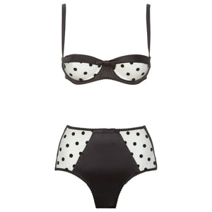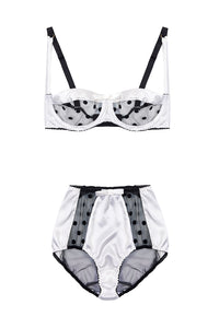 • White Stretch-Silk and Black Polka Dot Tulle Balconette Bra with High Waist Briefs Lingerie Set