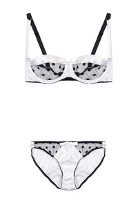 • White Stretch-Silk and Black Polka Dot Tulle Balconette Bra Lingerie Set